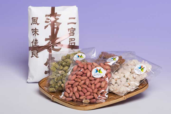野原さんの落花生も二宮ブランドの認定商品です。抹茶の落花糖が当店のオリジナルです。